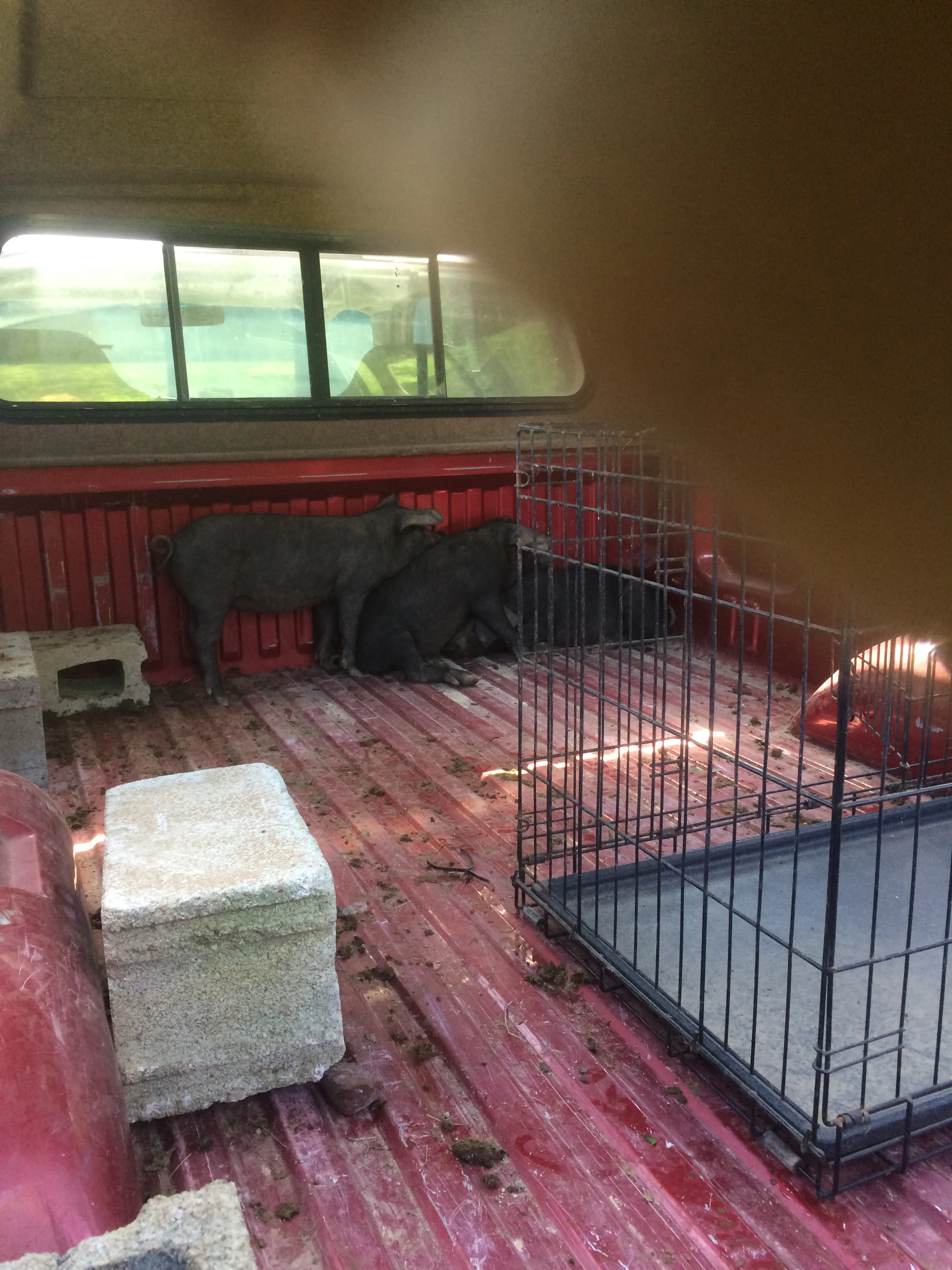 Once upon a time Lizzie, Jesse, and his father, Tony, got 3 little pigs from their farmer friends. The pigs were nice enough. Farmer Jesse drove the little pigs home in his truck and had a great plan for getting the little piggies into an area surrounded by electric fence, where they would spend their days eating grass, food and leftover veggies.