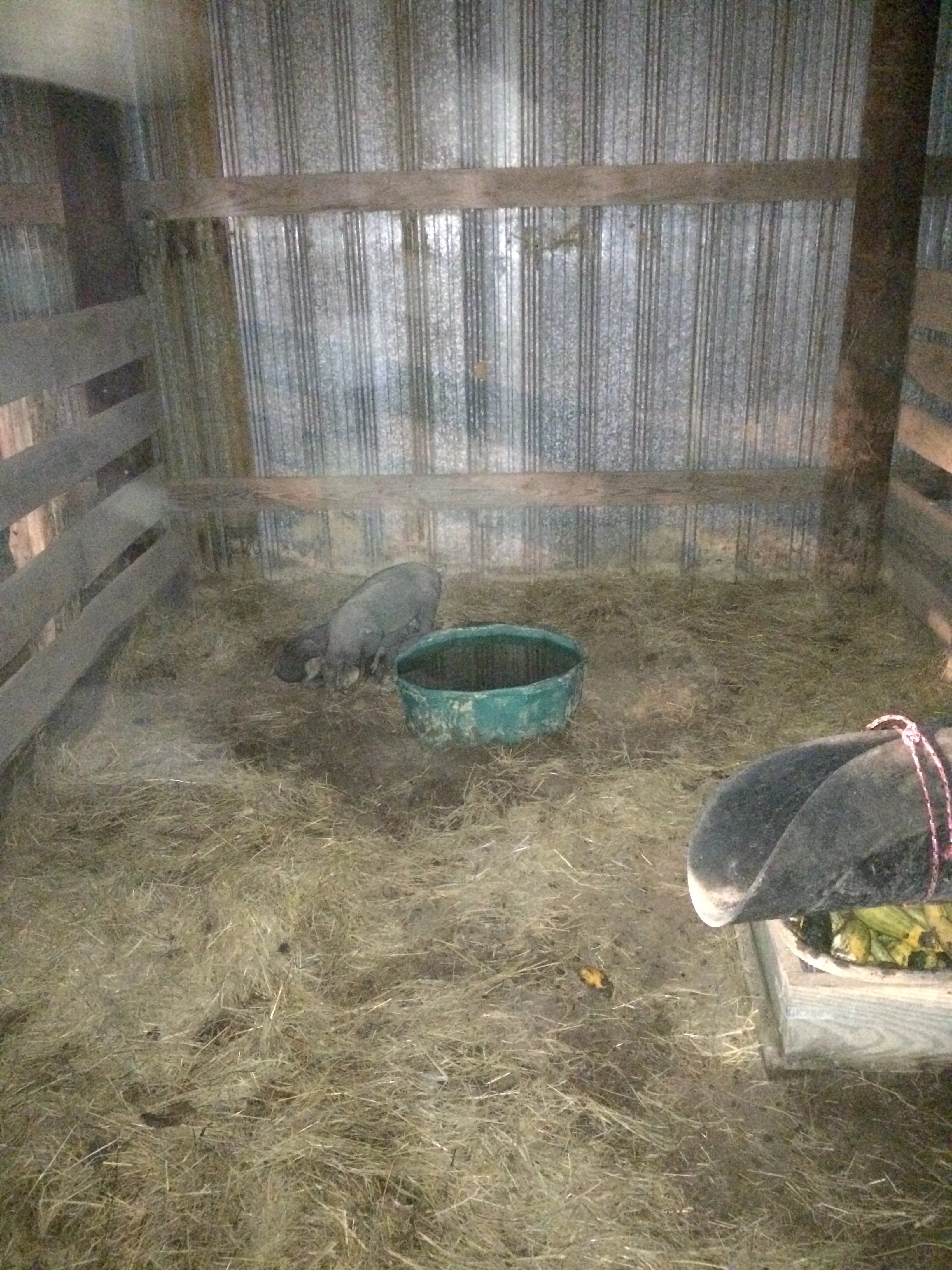 Jesse returned shortly after with the fence netting. They set it up and within minutes had the pig tangled and in the crate. Jesse and Tony spent the afternoon setting up a stall in the barn for the pigs and got them in there (somehow!) complete with good ole rotten squash and cucumber, a meal they readily ate and promptly layed in the mud for a nap. And thus concludes the Great Sugar Camp Pig Caper. For now.